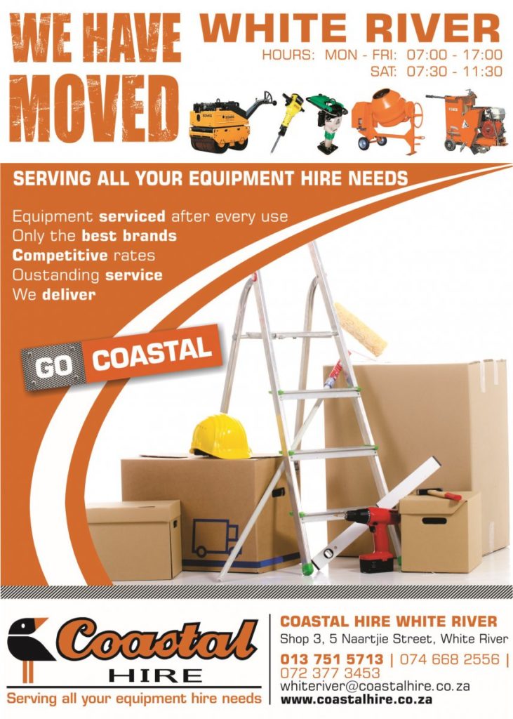 Coastal Hire White River has moved and is now located at Shop 3, 5 Naartjie Street, White River. The branch contact telephone numbers remain unchanged. Contact Coastal Hire White River for all your equipment hire needs.