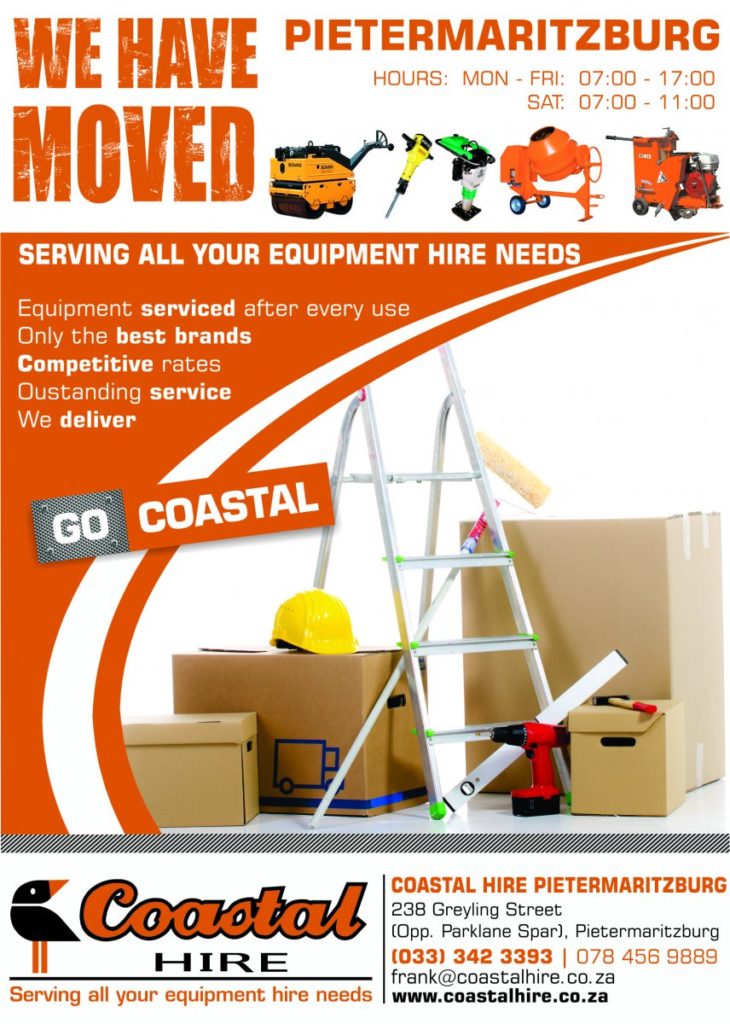Coastal Hire Pietermaritzburg has moved and is now located at 238 Greyling Street, Opposite of Parklane Spar. The branch contact telephone numbers remain unchanged. Contact Coastal Pietermaritzburg for all your equipment hire needs.
